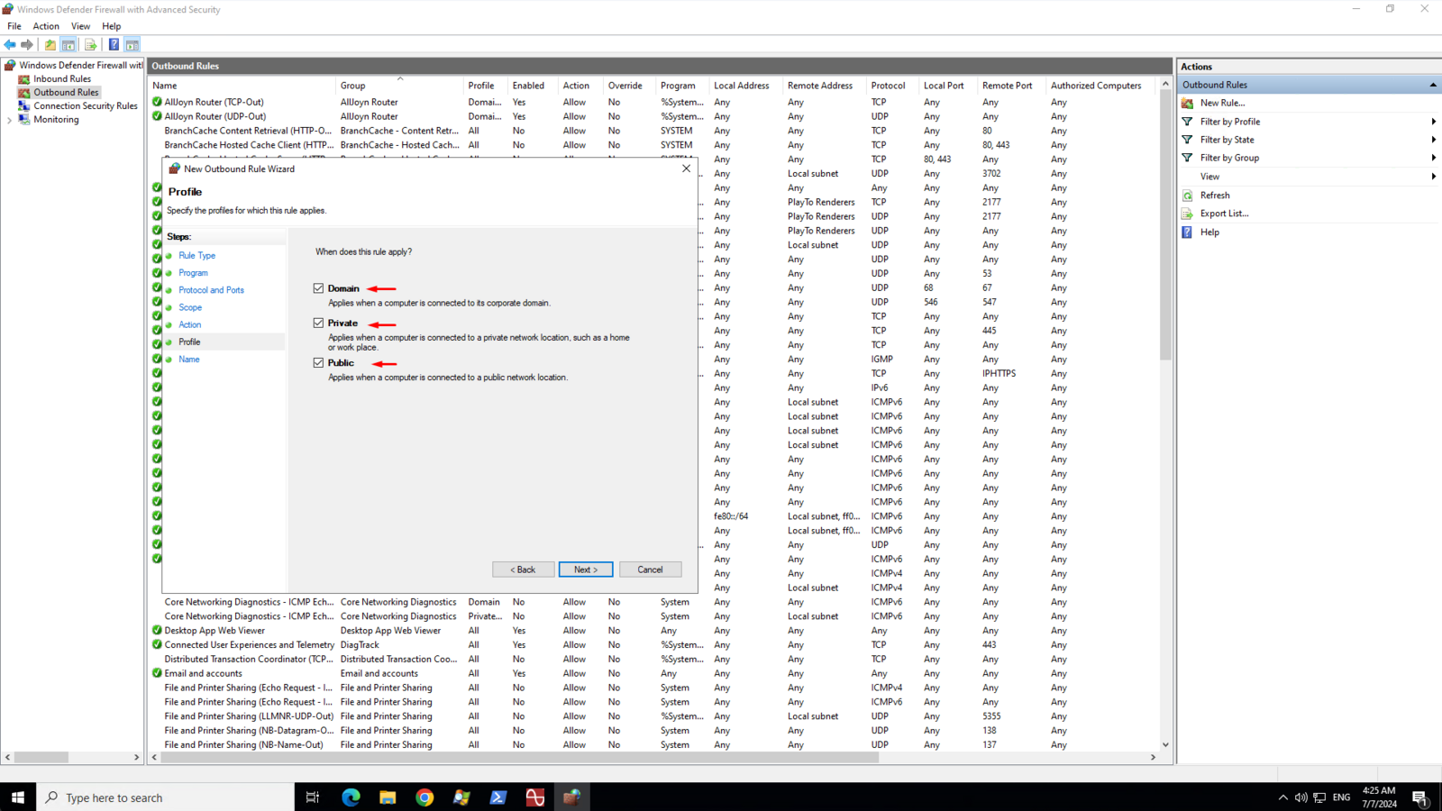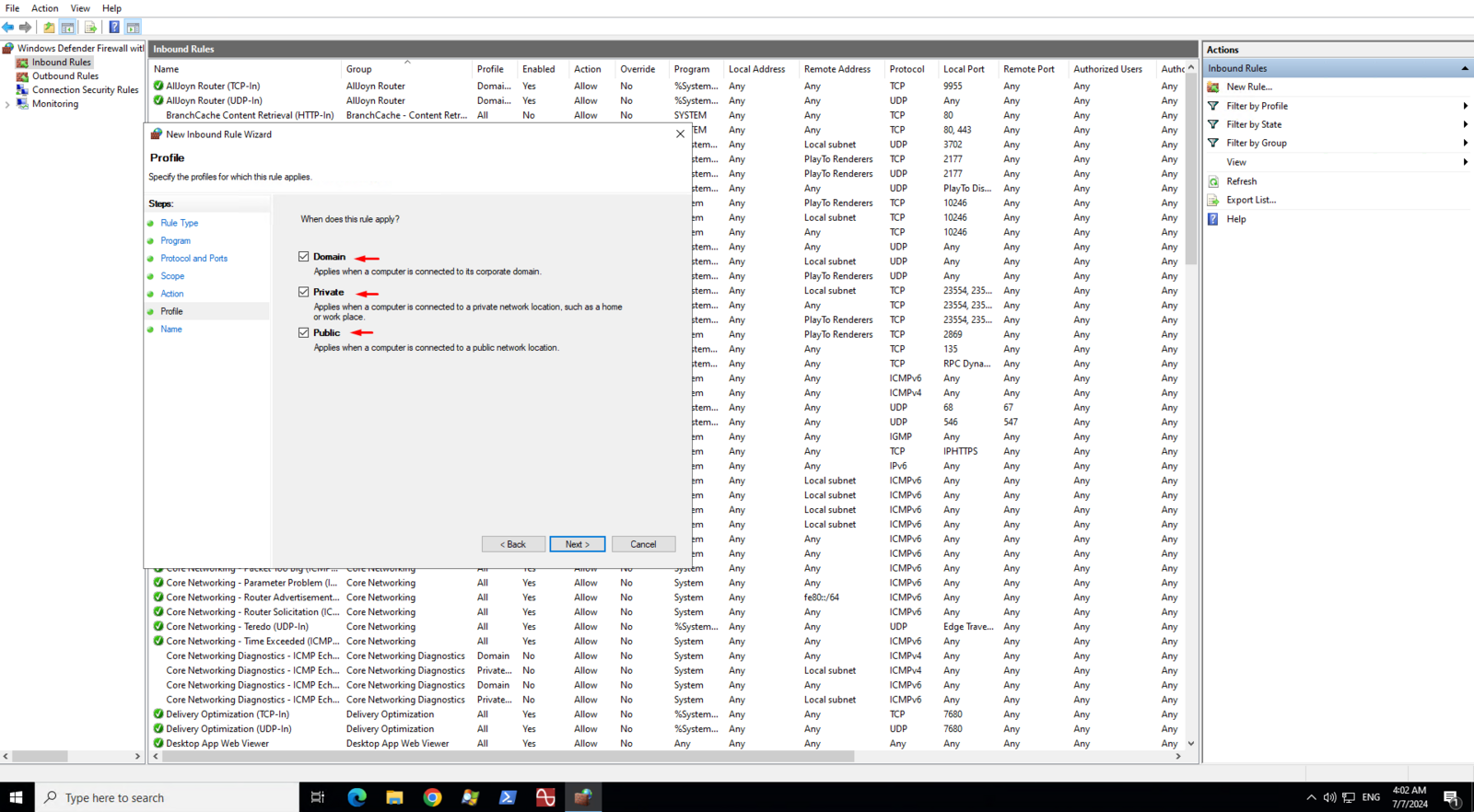 On the Profile page, make sure that Doman, Private, and Public are checked then click Next