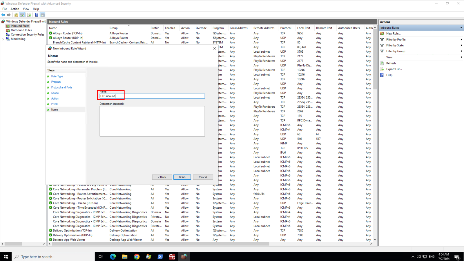 Enter a name or description for your FTP inbound rule