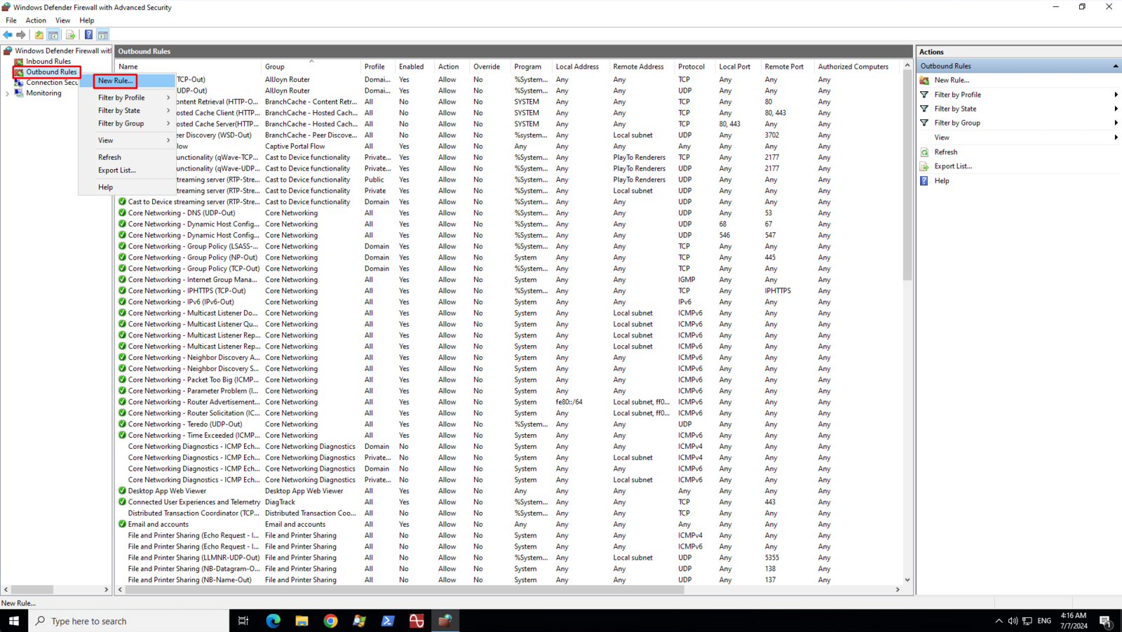 On the left pane, right-click on the Outbound Rules and then click New Rule