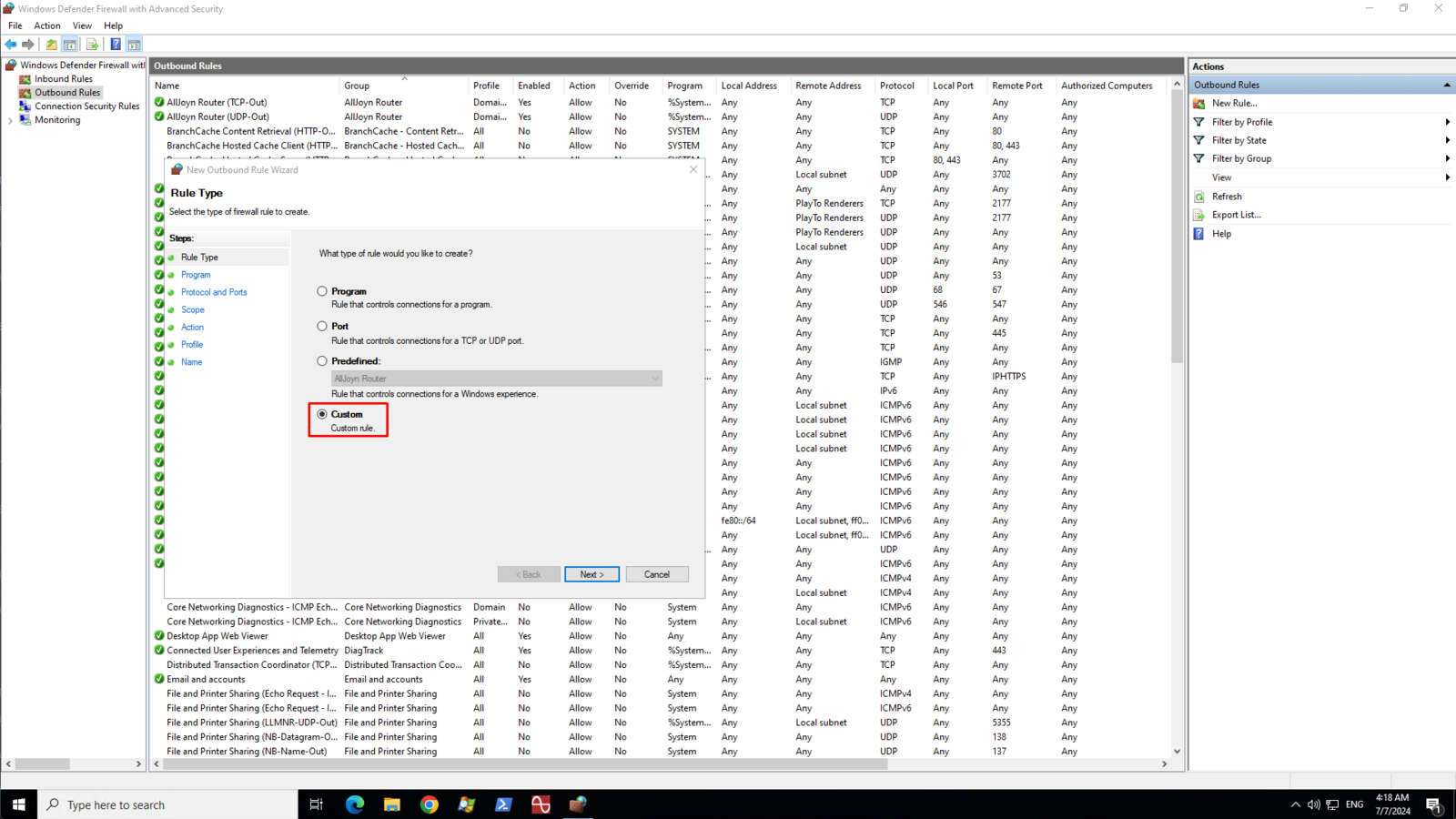 On the Rule Type page, select Custom then click Next