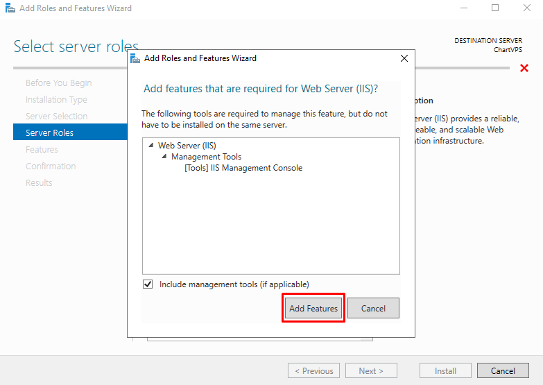 Click the Add Features button once you get a prompt about the tools required by IIS then click Next