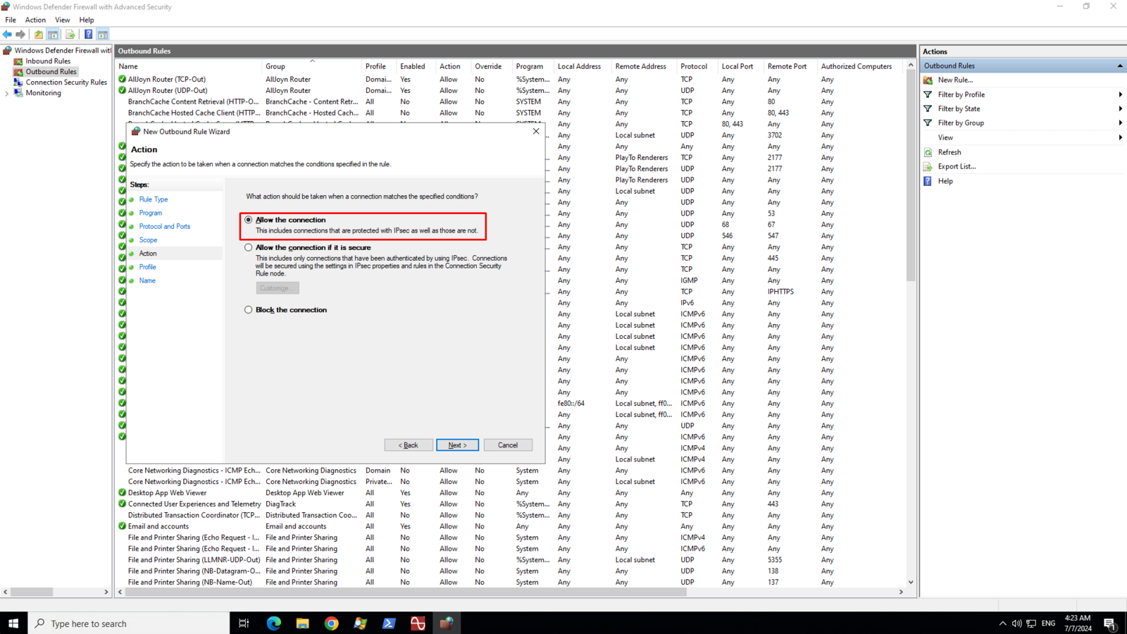 On the Action page, select Allow the connection then click Next