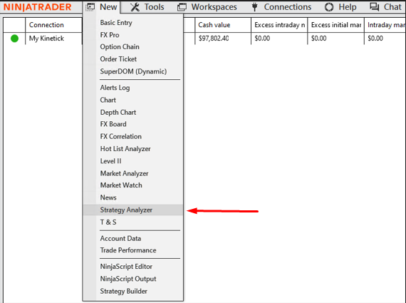 In the NinjaTrader Control Center, click on the ‘New’ menu and select ‘Strategy Analyzer’ from the dropdown list.