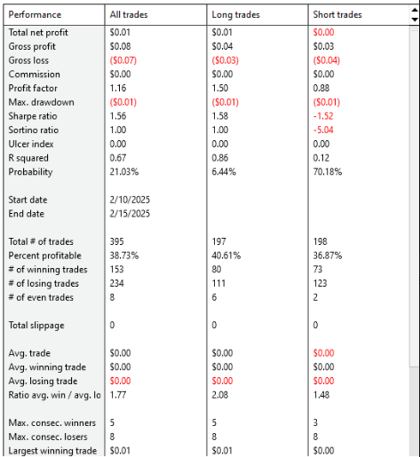 ✅ The strategy was slightly profitable but nearly breakeven with total net profit $0.01.