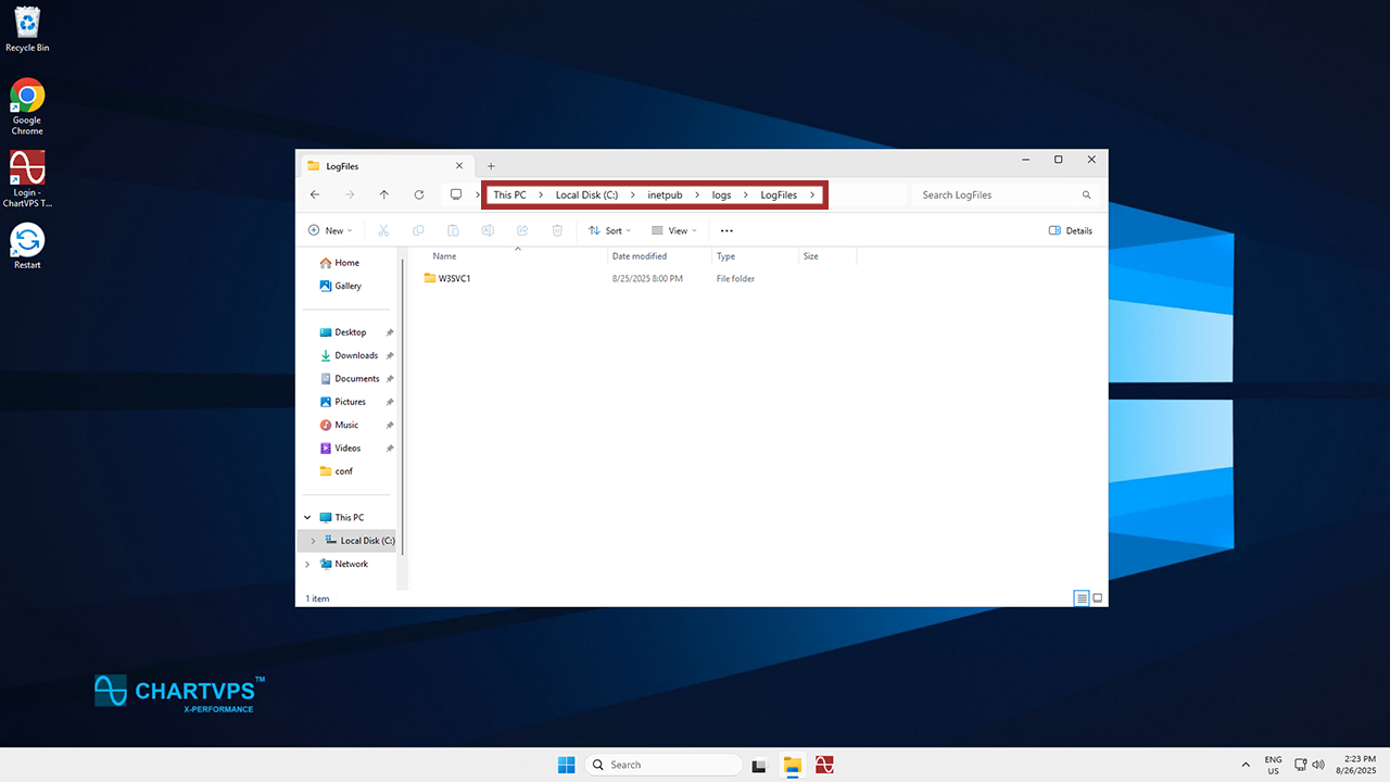 Time to locate the IIS log files. The default location for IIS log files is typically C:\inetpub\logs\LogFiles. To get in there, search for the File Explorer in the Windows search bar, then open it.