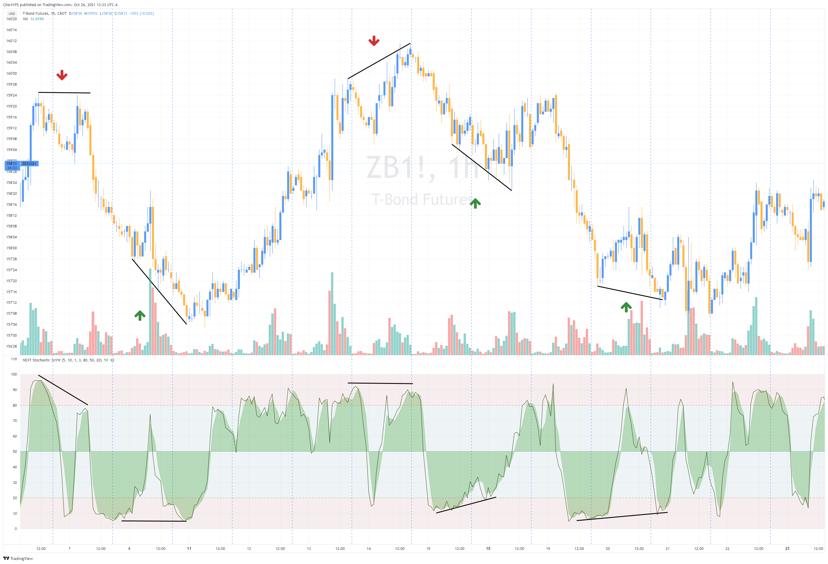 - Use as you would other divergence strategies: higher price highs, lower NEXT Stochastic 3xVW highs = bearish; lower price lows, higher NEXT Stochastic 3xVW lows = bullish