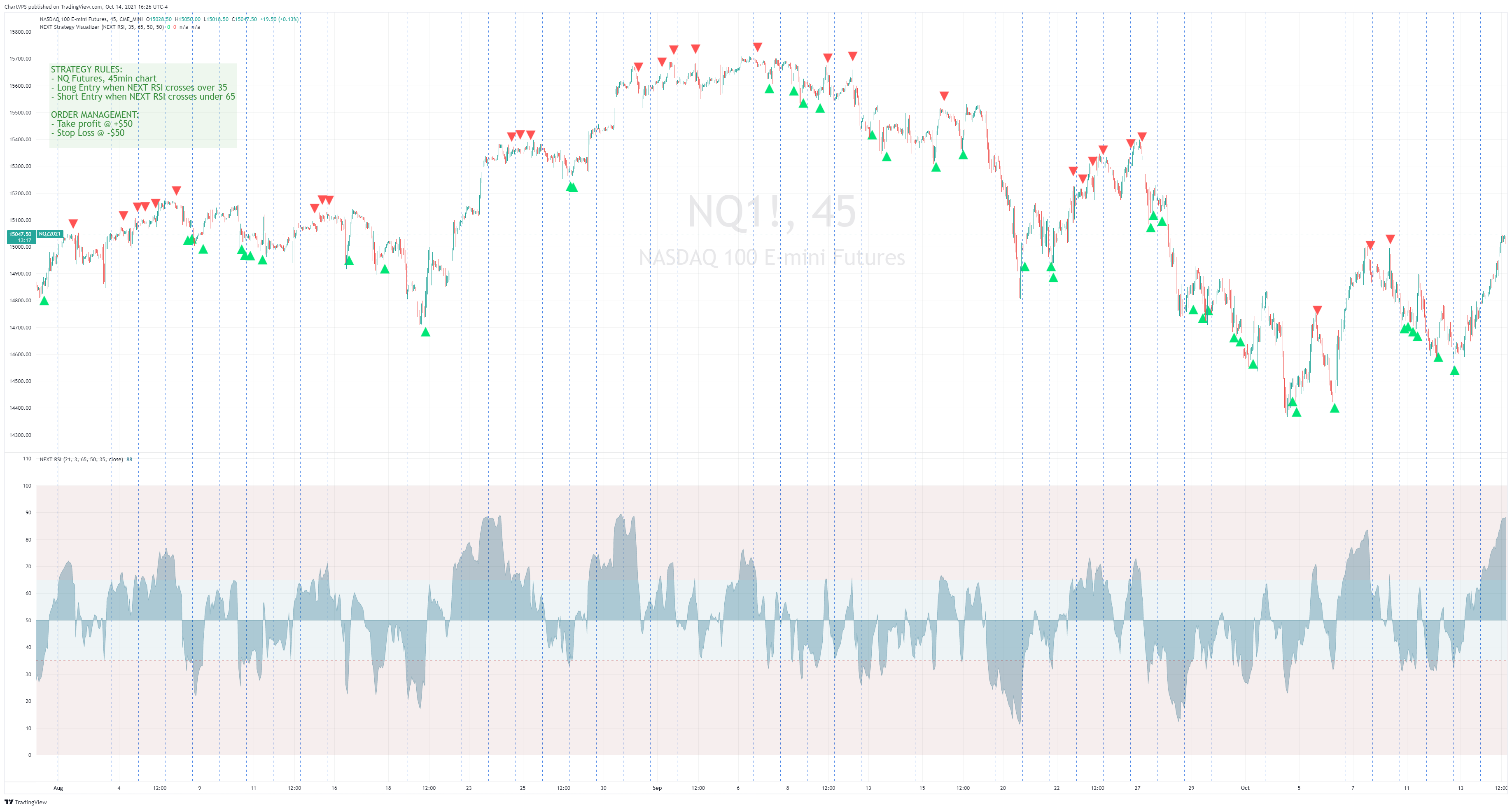 - NEXT Strategy Visualizer configured to Signal Source: NEXT RSI, LE @ 35, SE @ 65