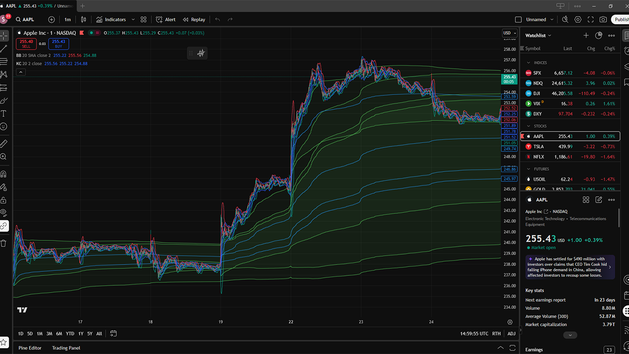 A classic squeeze setup occurs when the Bollinger Bands move inside the Keltner Channels. That tells you standard deviation (BB) has contracted so much it fits within the ATR‑based envelope (KC) – i.e., volatility is compressed and poised to expand.